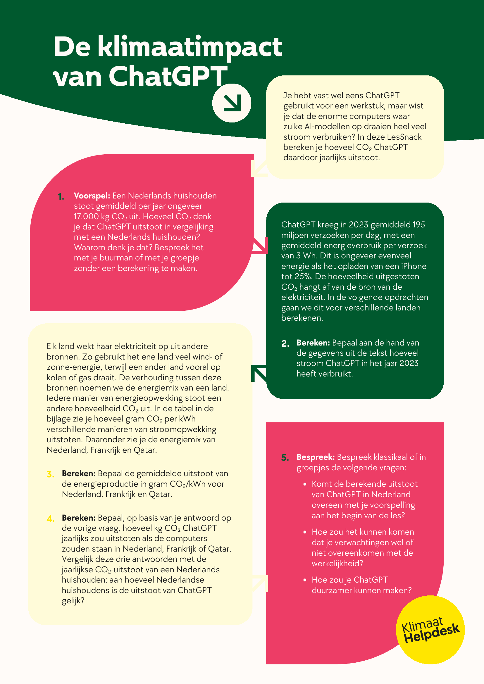 In deze LesSnack voorspellen, berekenen en beargumenteren leerlingen hoeveel kilogram CO₂ ChatGPT jaarlijks uitstoot. De leerlingen voorspellen eerst of de CO₂-uitstoot van ChatGPT hoger of lager is dan dat van een Nederlands huishouden. Vervolgens berekenen ze hoeveel stroom ChatGPT per jaar verbruikt en hoeveel CO2 hierbij wordt uitgestoten, op basis van de energiemixen van drie verschillende landen. Tot slot reflecteren leerlingen op hun antwoorden: is dit hoger of lager dan verwacht, en waardoor komt dat?