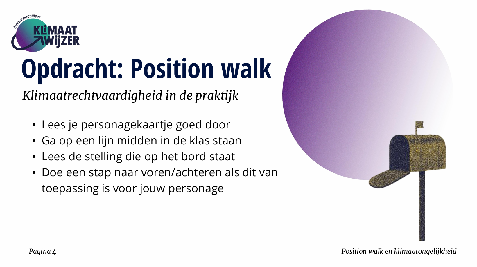Klimaatonrechtvaardigheid is complexer dan het soms lijkt. Deze position walk is ontworpen om klimaatonrechtvaardigheid te kunnen ervaren. Leerlingen leven zich in in hoe verschillende mensen klimaatproblematiek en oplossingen anders ervaren. Misschien is de reflectie nog wel het belangrijkste onderdeel van deze les. Wat betekent het nu precies als jij een stap naar voren mag doen en een ander niet? Welke persoonlijke factoren spelen dagelijks een rol op het vermogen van mensen op actie te ondernemen? En hoe kan het dat klimaatbeleid niet altijd iedereen op dezelfde manier raakt?