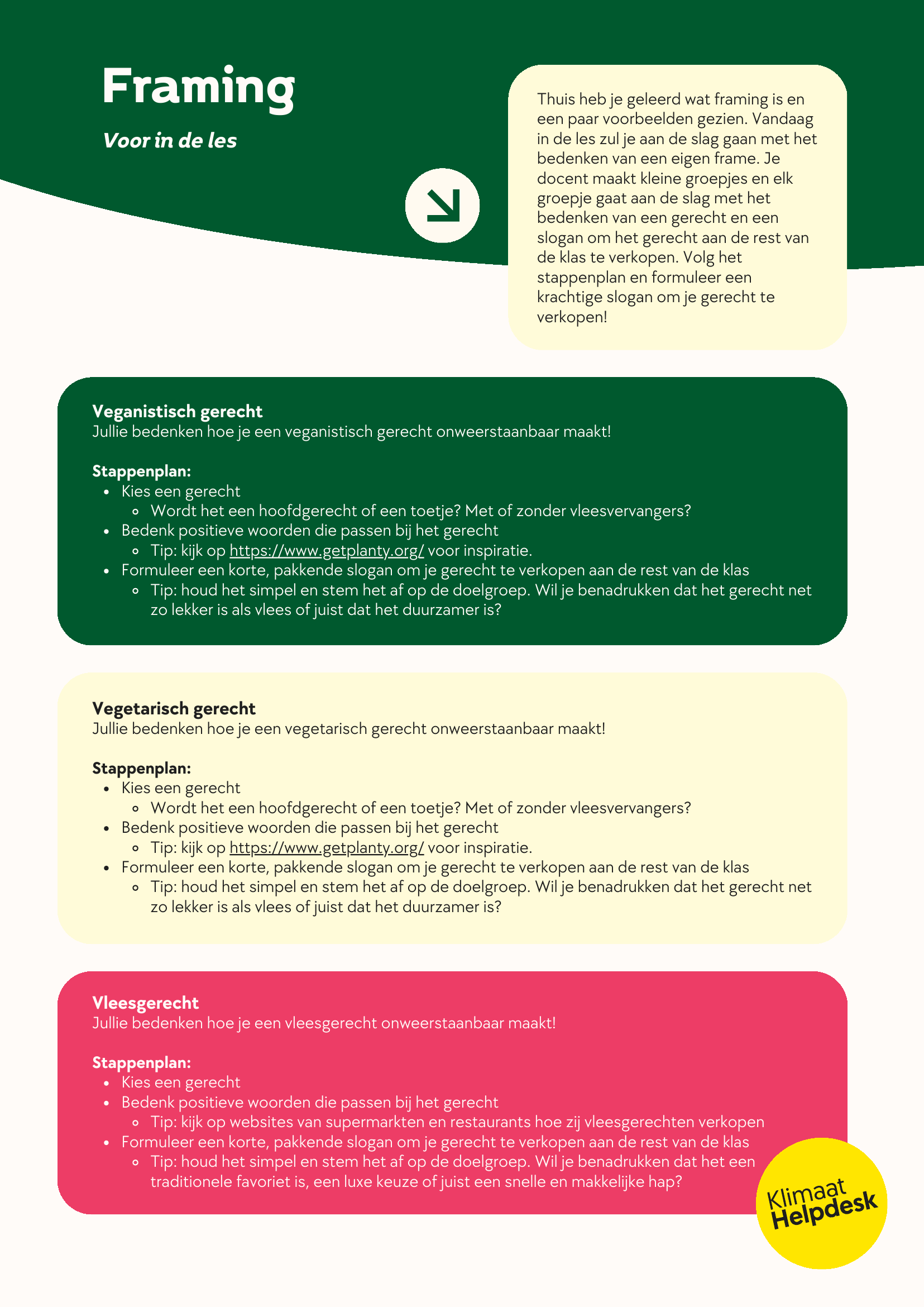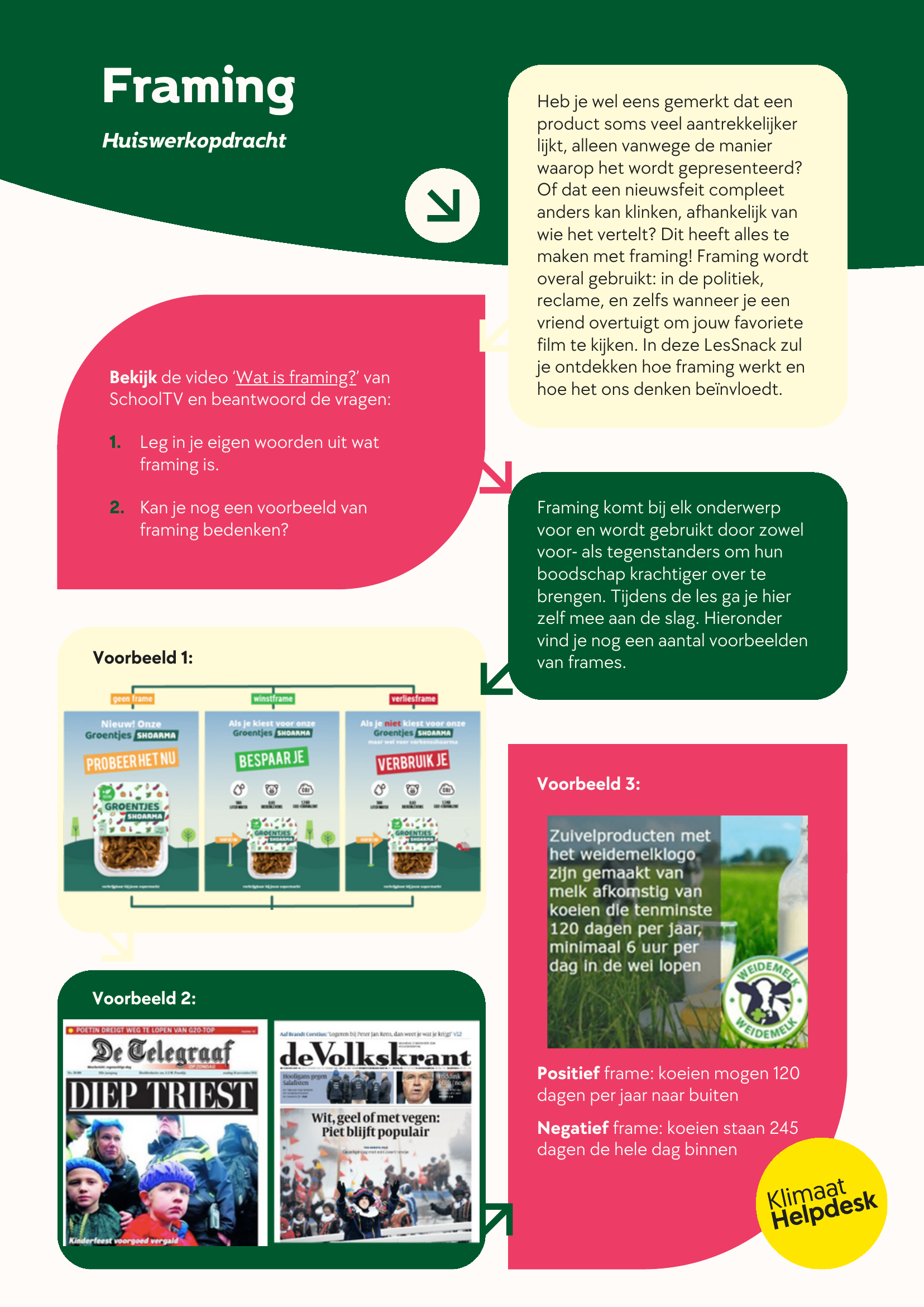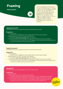 In deze LesSnack leren leerlingen over framing, iets wat erg belangrijk is en vaak voorkomt in het publieke debat. Aan de hand van een korte huiswerkopdracht zullen leerlingen erachter komen wat framing is. In de les zullen ze vervolgens zelf een frame proberen te bedenken in kleine groepjes om hun vegetarische of niet-vegetarische gerecht te verkopen aan de rest van de klas.
