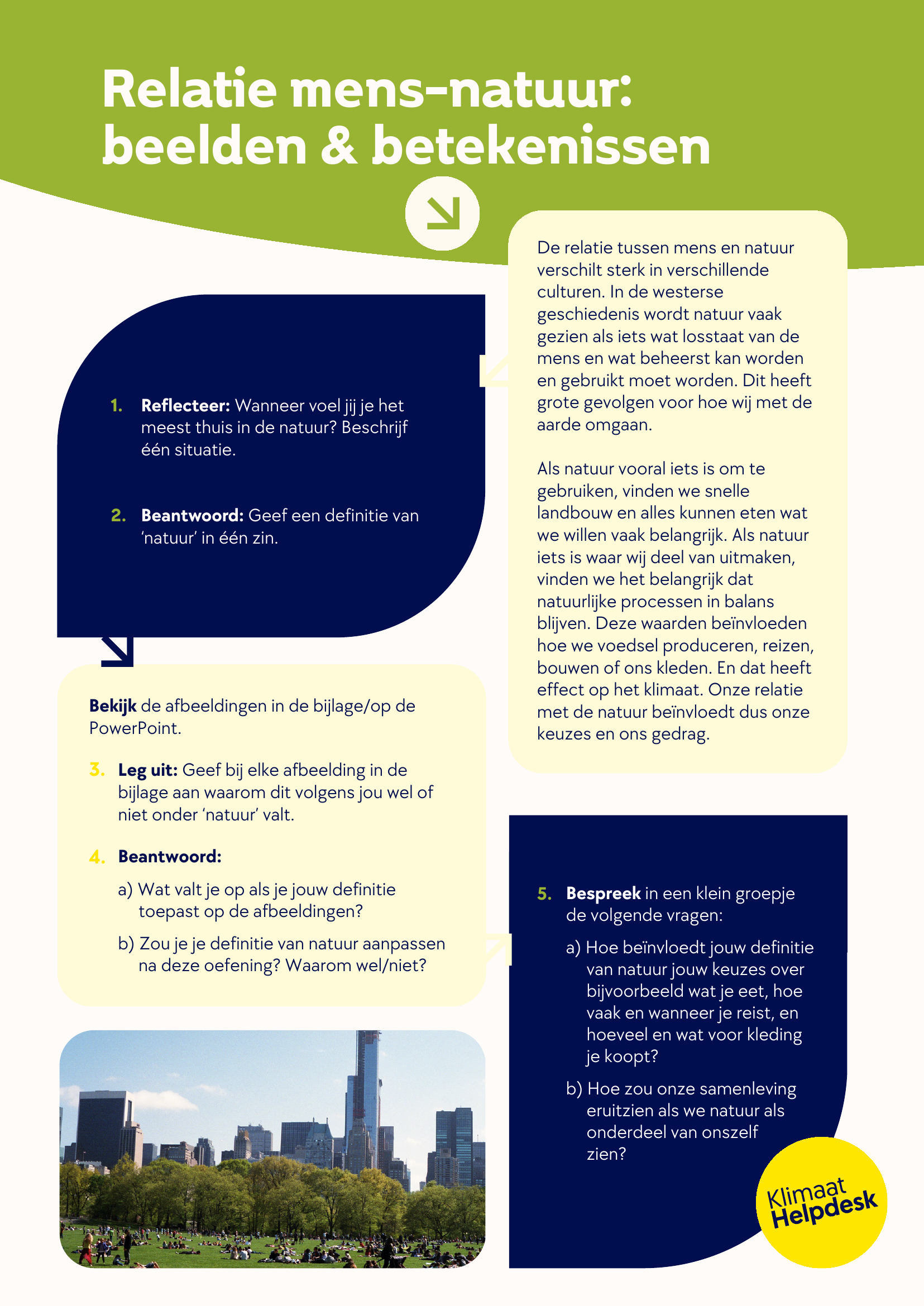 In deze LesSnack reflecteren leerlingen op hun relatie met de natuur en denken ze na over hoe dit het klimaat beïnvloedt. Aan de hand van afbeeldingen en enkele reflectievragen worden leerlingen aangezet tot het nadenken over hun eigen assumpties.