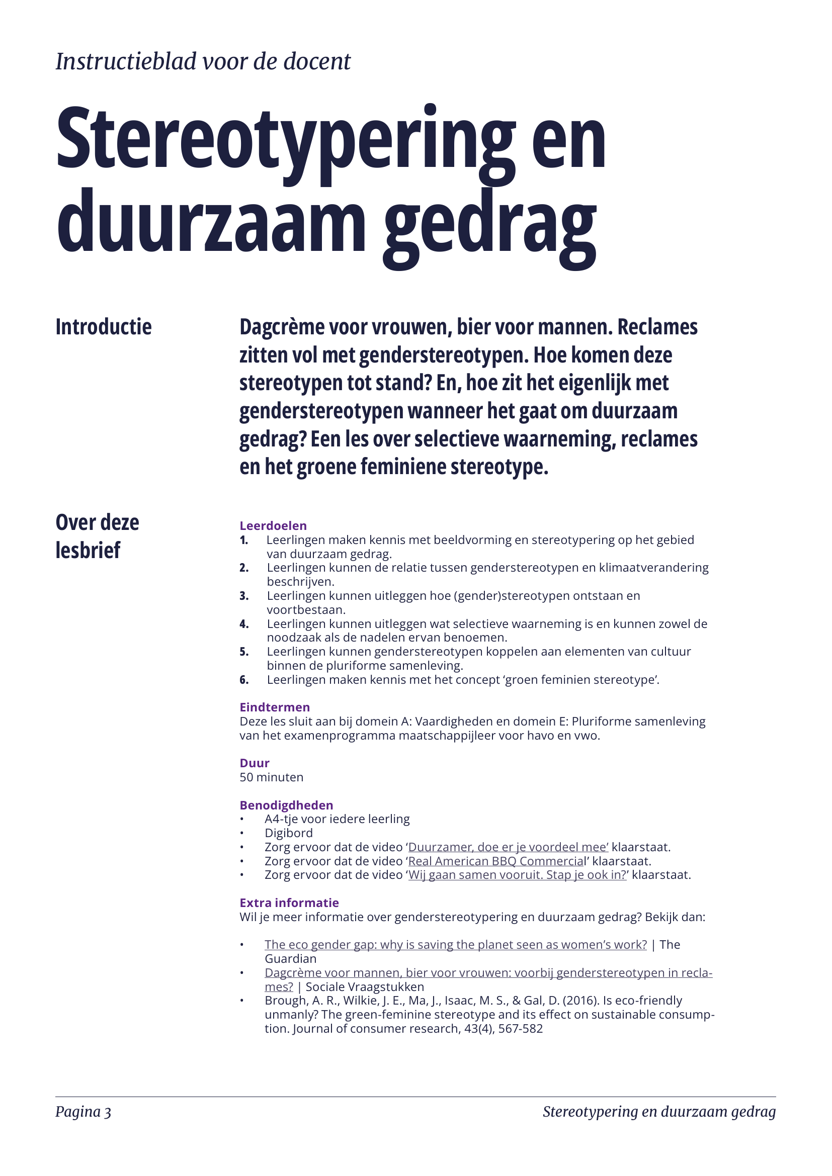 Enige voorkennis over genderrollen, stereotypering en selectieve waarneming kan handig zijn, hoewel deze termen ook uitgelegd worden in de les.