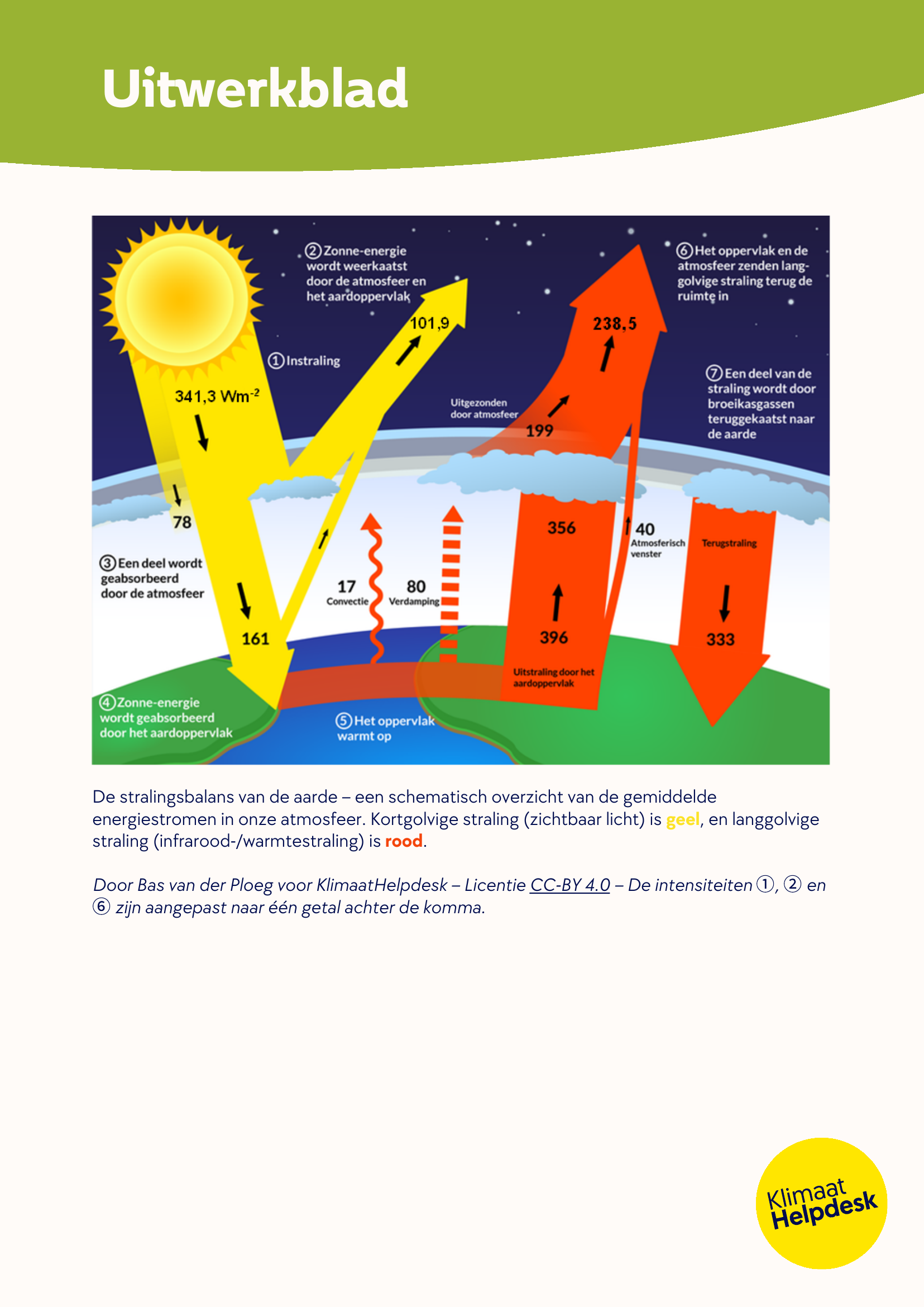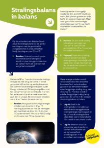In deze LesSnack ontdekken leerlingen wat er met de stralingsenergie van de zon op aarde gebeurt aan de hand van de stralingsbalans. Ze voorspellen en berekenen dat bijna alle zonne-energie uiteindelijk wordt teruggezonden de ruimte in, conform de wet van behoud van energie. Vervolgens bekijken ze wat er gebeurd met de energie die achterblijft op de aarde: deze energie-onbalans warmt de aarde op, en verklaart de huidige klimaatverandering. Ten slotte beredeneren ze waarom we de opwarming van de aarde kunnen stoppen als we de concenratie broeikasgassen in de atmosfeer verminderen.