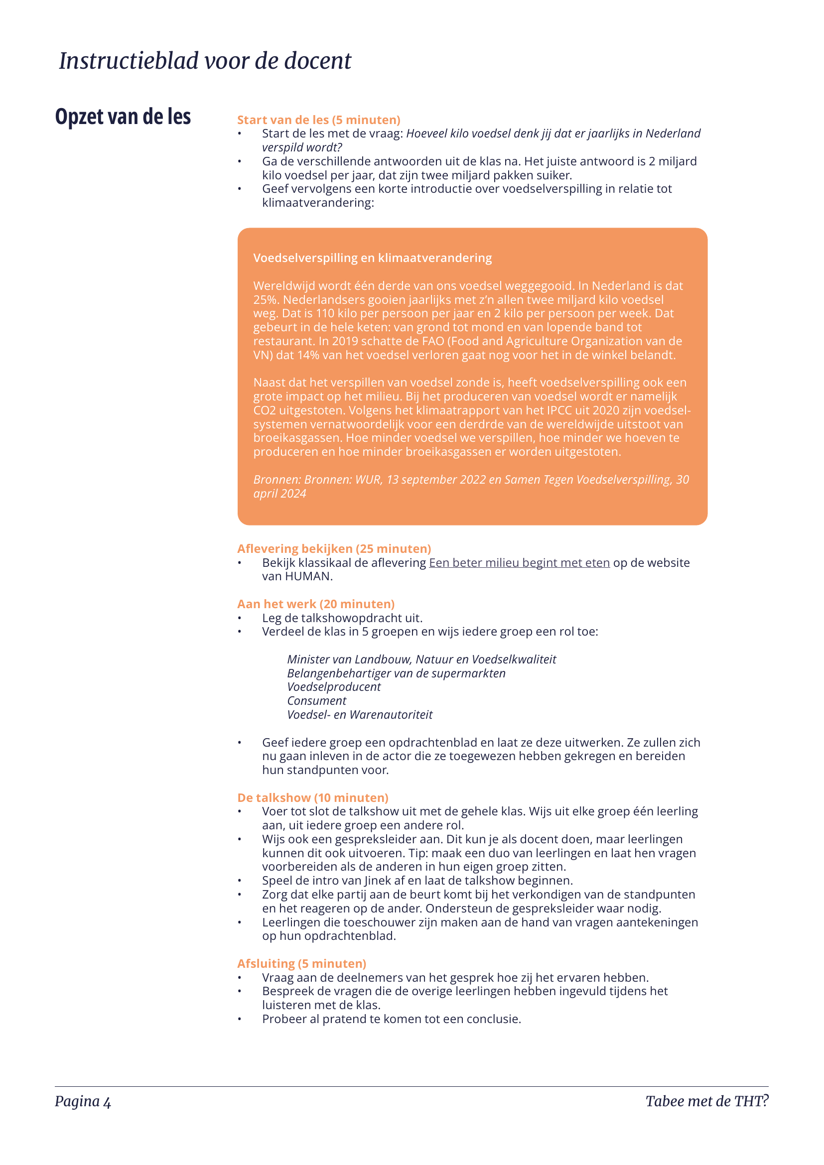 Deze les duurt 50-60 minuten en bestaat uit een talkshowopdracht. Wil je dieper ingaan op voedselverspilling? Bekijk dan ook onze lessenserie ‘Begint een beter milieu met eten?‘.