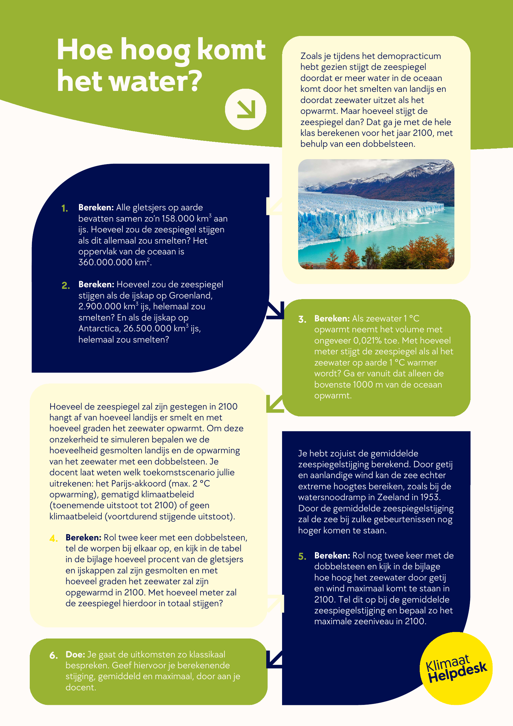 In deze LesSnack voorspellen leerlingen de zeespiegelstijging in 2100. Tijdens een demopracticum zien ze dat de zeespiegel stijgt door het smelten van landijs en het uitzetten van zeewater, en niet door het smelten van zee-ijs. Door te rekenen met dichtheden, volumes en oppervlaktes vinden leerlingen de potentiële zeespiegelstijging als al het landijs smelt en het zeewater met 1 graad opwarmt. Vervolgens bepalen ze met een dobbelsteen hoeveel procent van de gletsjers en ijskappen er daadwerkelijk zal smelten en hoeveel graden het zeewater zal opwarmen. Door alle uitkomsten te verzamelen vind je een verdeling voor de zeespiegelstijging in 2100, welke je klassikaal kunt bespreken.